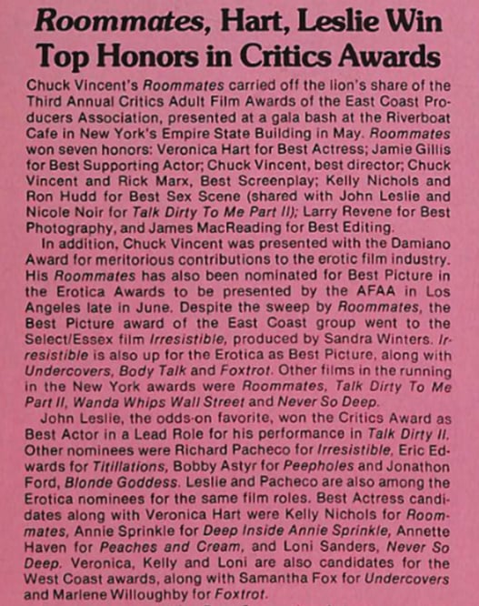 En 1981 Roommates de Chuck Vincent, es la contraparte femenina de The Dancers la película cuenta la historia de un trío de mujeres que intentan llegar a la ciudad de Nueva York. Protagonizada por Samantha Fox como Billie, una exprostituta que trata de triunfar en el mundo heterosexual, Kelly Nichols como Sherry, una modelo de California con problemas de drogas, y Veronica Hart como Joan, una aspirante a convertirse en actriz.