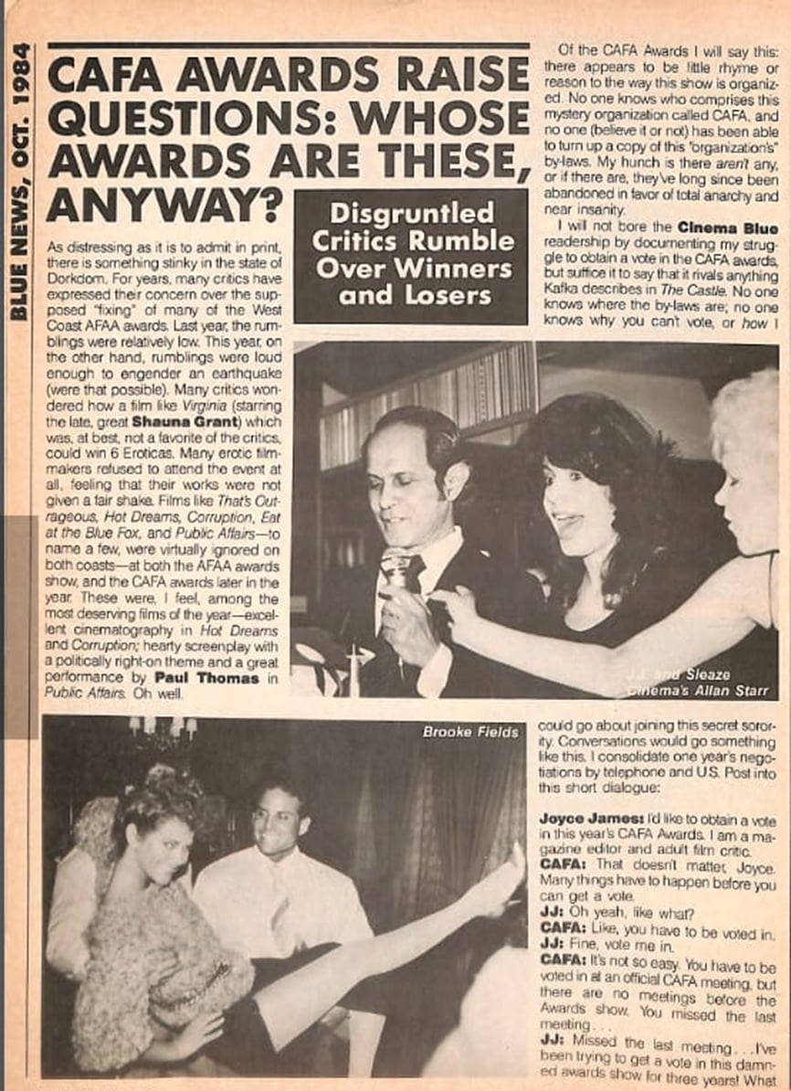 Critics Adult Film Association fue un grupo de críticos, que otorgó premios a quienes trabajan en películas artísticas con clasificación X.  CAFA era equivalente al Golden Globe concedido por la Hollywood Foreign Press Association (HFPA). Los premios se entregaron por primera vez en 1981, en honor a las películas del año inmediatamente anterior.  John Leslie ganó el premio a Mejor Actor por The Dancers. Samantha Fox fue la primera en obtener el premio a Mejor Actriz, por su personaje en This Lady Is A Tramp, y Richard Pacheco logró la estatuilla a Mejor Actor de Reparto por The Dancers (foto).