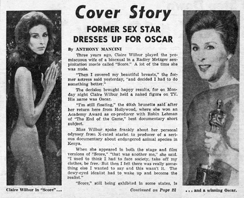 La actriz de método Claire Wilbur nació el 8 de junio de 1933 en Connecticut. Actriz de teatro y cine fue protagonista con Silvestre Stallone de la exitosa obra teatral Score escrita por Jerry Douglas con 23 presentaciones del 28 de octubre al 15 de noviembre de 1970. La actriz de “método” Claire Wilbur estudió con Stella Adler en el Stella Adler Studio of Acting e interpretaría el mismo personaje de Score en la magistral adaptación para adultos dirigida por Radley Metzger en 1974. Su otra incursión como actriz sería en la película Teenage Hitchhikers (1975), también coprodujo los cortometrajes escritos y dirigidos por su novio Robin Lehman, The End of the Game (1975) y Nightlife (1976). Claire Wilbur ganó el Premio de la Academia por The End of the Game y además escribió dos libros sobre el felino del japonés Maneki Neko. Wilbur falleció en Manhattan a los 70 años el 20 de mayo de 2004.