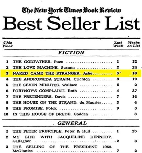 El 2 de noviembre de 1969 Naked Came the Stranger de Penelope Ashe alcanzó a ser el número 3 en la lista de Best Sellers de los libros más vendidos según el diario The New York Times, seguido por The Love Machine de Jacqueline Susann, y The Godfather de Mario Puzo. En años posteriores todas se convertirían en adaptaciones cinematográficas y alcanzarían el mismo éxito que la edición impresa. Naked Came the Stranger es la única película X de la historia basada en un best seller por el que la productora compró los derechos para realizarla.