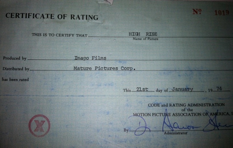 Certificados calificación de las películas X: High Rise (AFAA Danny Steinmann, 1974) y Maraschino Cherry (AFAA Radley Metzger, 1978), otorgados por la MPAA.