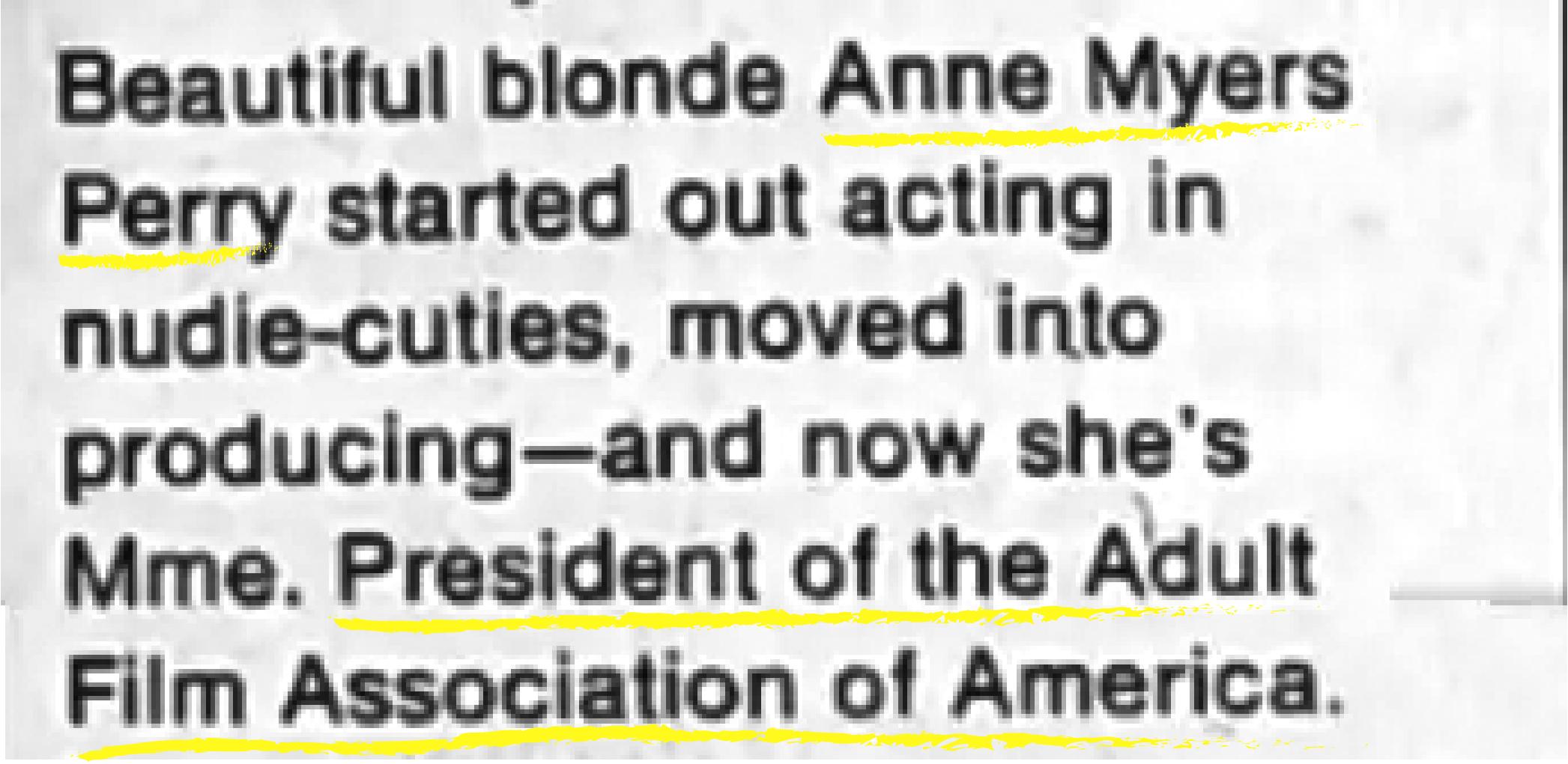 La primera mujer presidenta de la AFAA fue Anne Perry 1977-1979 actriz, guionista y productora de Evolution Enterprises, seguida de Maria Tobalina 1980-1981 actriz, productora y esposa del guionista y director peruano, Carlos Tobalina quien trabajaría en Hollywood con actores de la talla de Yvonne De Carlo recordada por su personaje de Lily en La Familia Monsters, y el actor de teatro, César Romero como el Guason, en la serie de televisión Batman, y Gloria Leonard 1989-1992 actriz y editora de la revista para adultos, High Society.