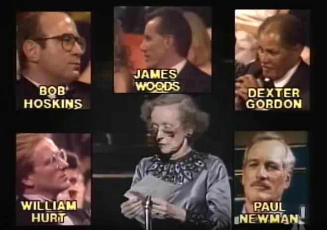 Nominados a Mejor Actor Protagónico premios Oscar comunica la actriz Bette Davis en 1987.