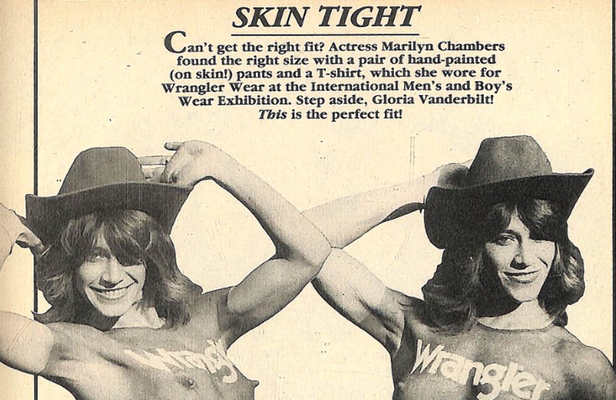 La actriz integral Marilyn Chambers fue contratada en Londres como modelo por la marca Wrangler. Su cuerpo fue pintado a mano por los artistas Chistine Moodie y Barry Reilly para la Exposición Internacional de Ropa para Hombres y Niños. Fuente: High Society, (Vol 5, No. 1) p. 29 de junio de 1980.