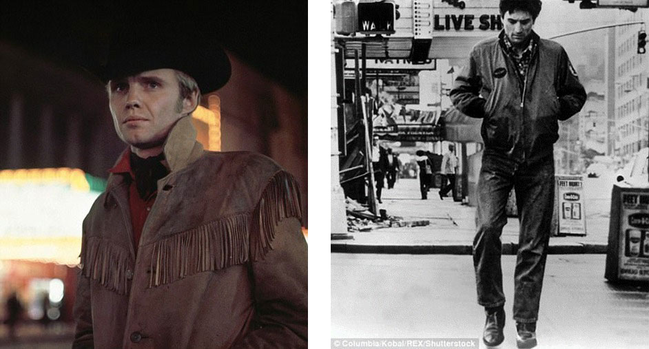 Películas como Midnight Cowboy (1969) y Taxi Driver (1976) retrataron el lado más sexual de la calle más importante del teatro estadounidense. En Midnight Cowboy, Jon Voight interpretó a Joe Buck (derecha) un hombre de Texas que se muda a Nueva York para convertirse en un gigoló. En Taxi Driver, Robert De Niro interpretó a Travis Bickle (izquierda), un veterano de guerra y solitario que vive en Nueva York.