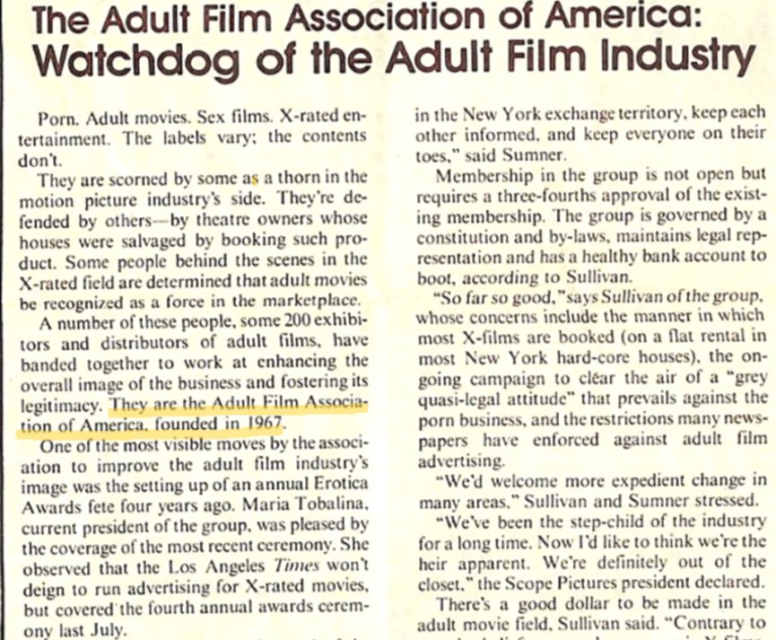 Más adelante Friedman precisa el objeto misional de la AFAA: “Uno de los objetivos fundamentales de la AFAA siempre ha sido alentar a los miembros a mejorar la calidad de sus películas. En nuestras convenciones hemos tenido paneles de los principales críticos de cine, discutiendo por qué hicieron o no reseñaron películas de clasificación X y qué pensaron de ellas. Creo en gran medida que hemos promovido una actualización de estas películas: mejores valores de producción, mejor actuación y mejor dirección, cada vez el público se ha vuelto mucho más exigente”.